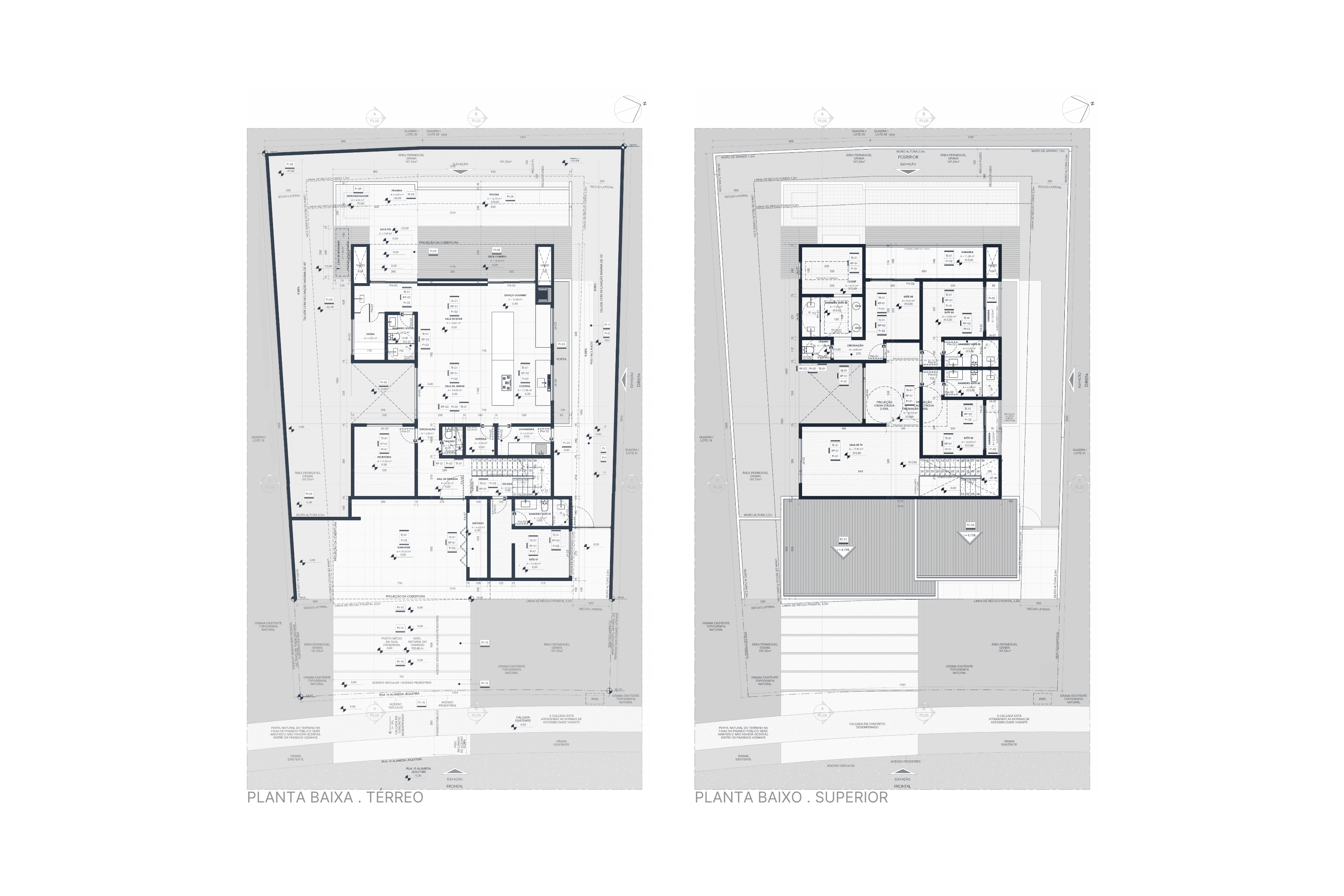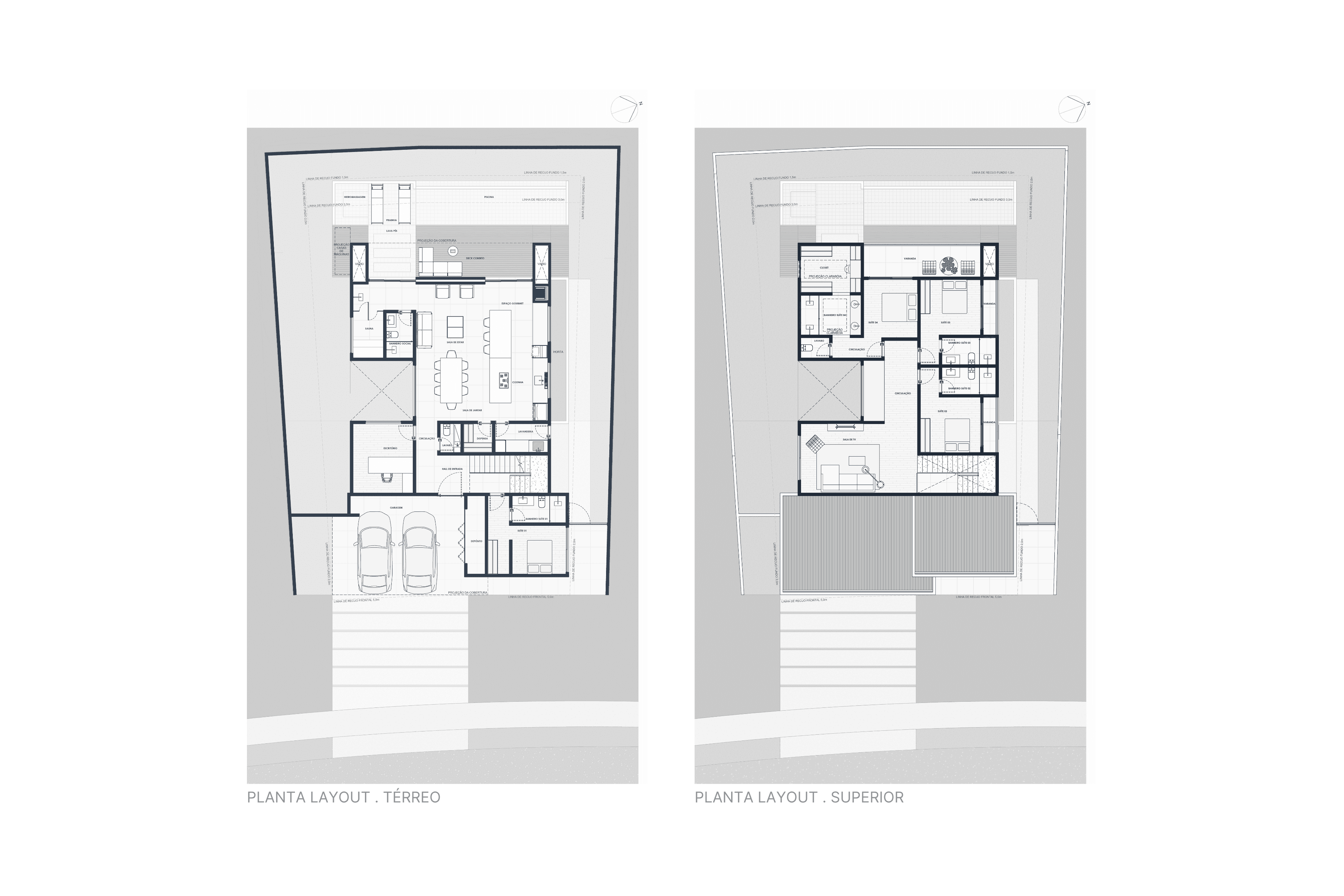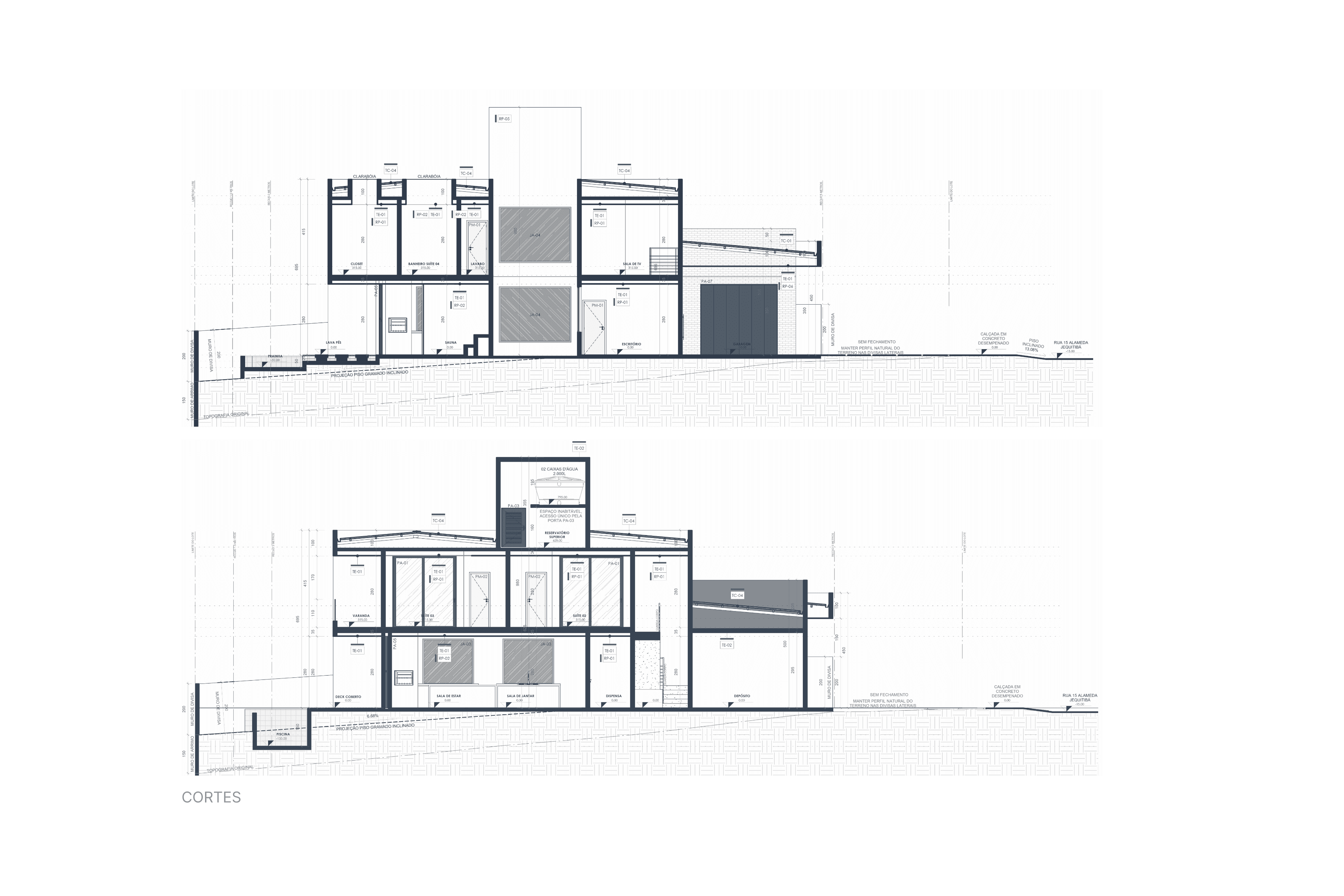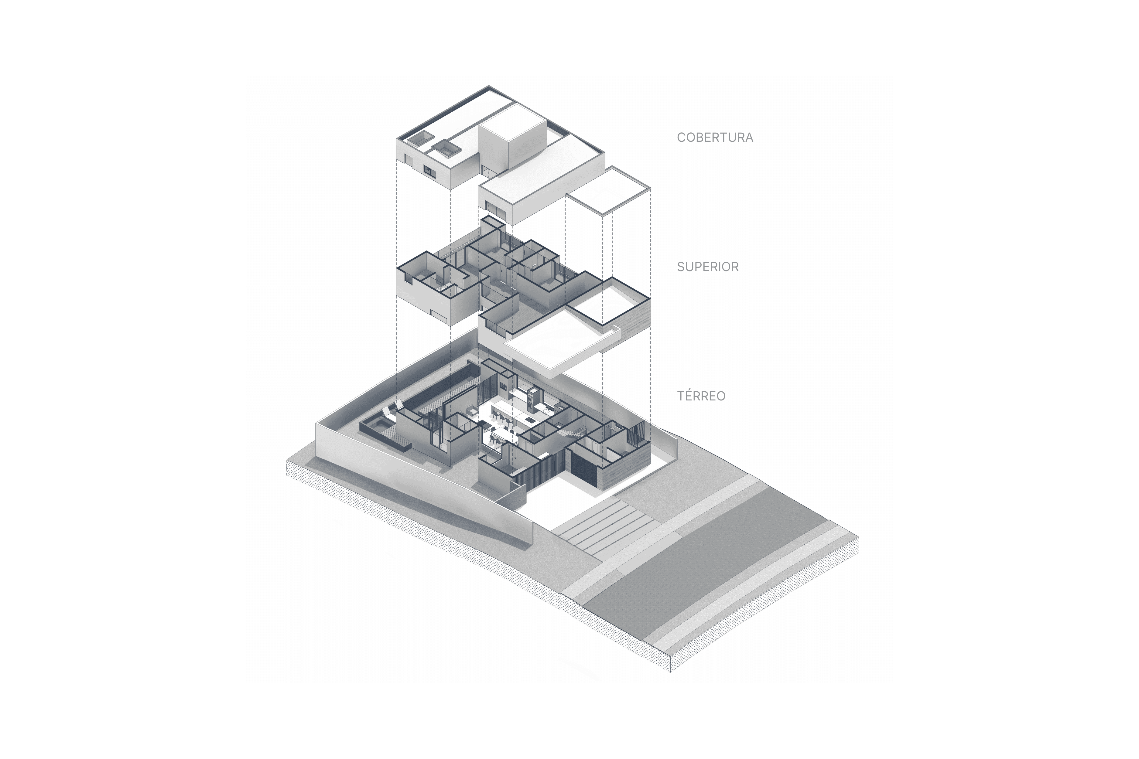 A proposta prioriza volumetria limpa, integração entre ambientes e adaptação ao relevo natural do terreno, resultando em uma composição contemporânea e funcional.